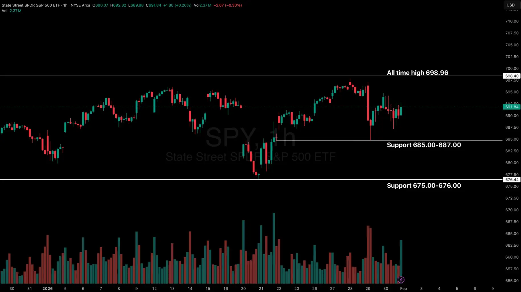 The CBOE Volatility Index ticked higher as major indexes swung to close the month. SPY faces significant resistance at its all-time high level of 698.96.